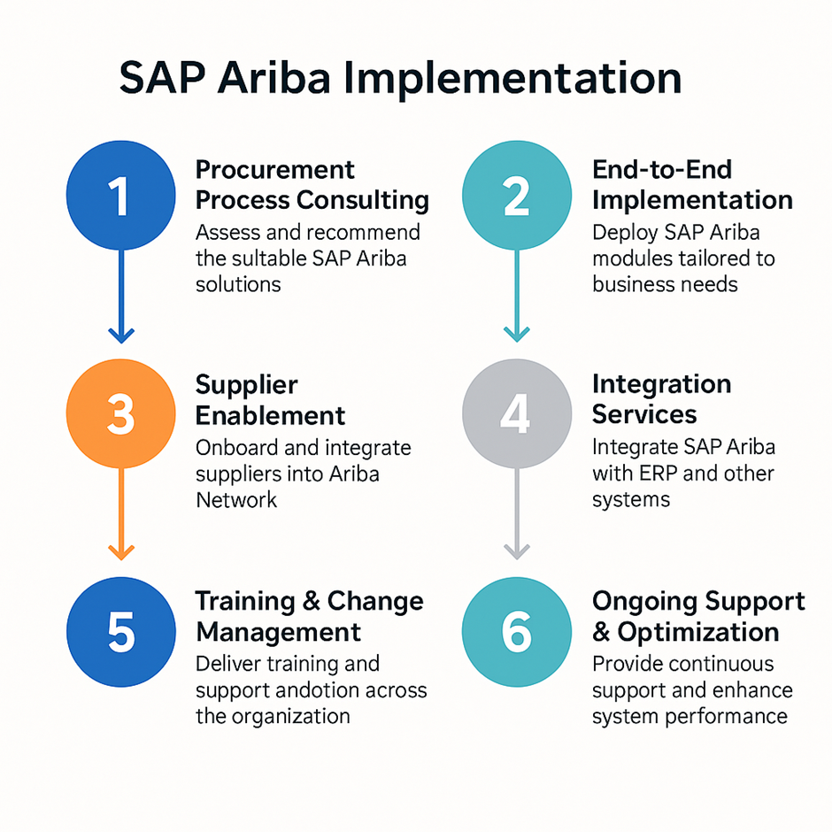 - Continuous Support & Optimization - Beyond go-live, we help you extract long-term value from Ariba through upgrades, performance tuning, and adoption analysis.
